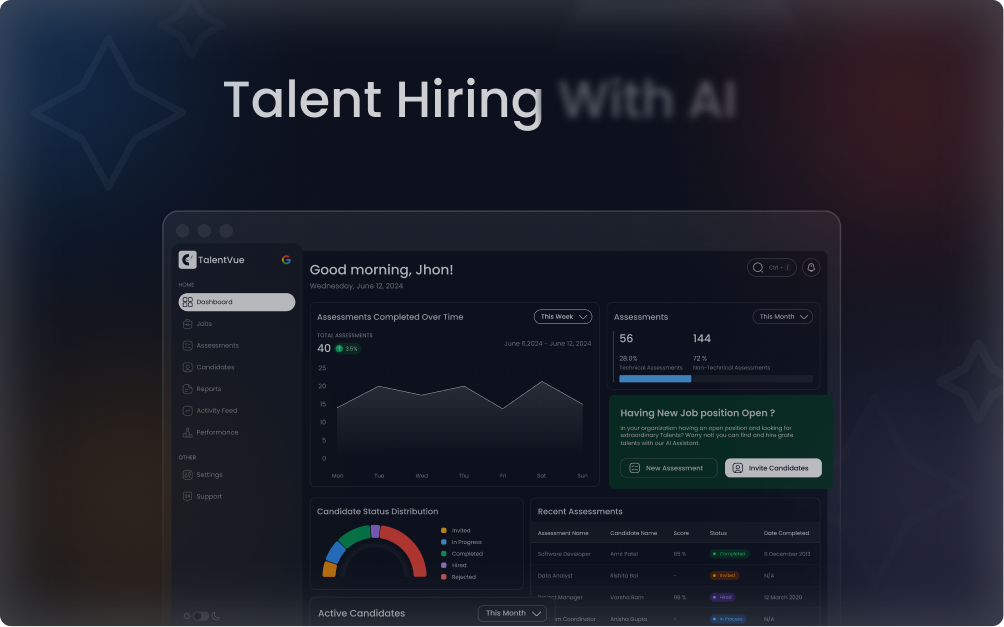 TalentVue works by allowing businesses to create job profiles, invite candidates to take AI-powered assessments, and analyze detailed performance reports. The platform uses AI axlorithms to assess candidates’ skills and match them to the right roles based on their performance.